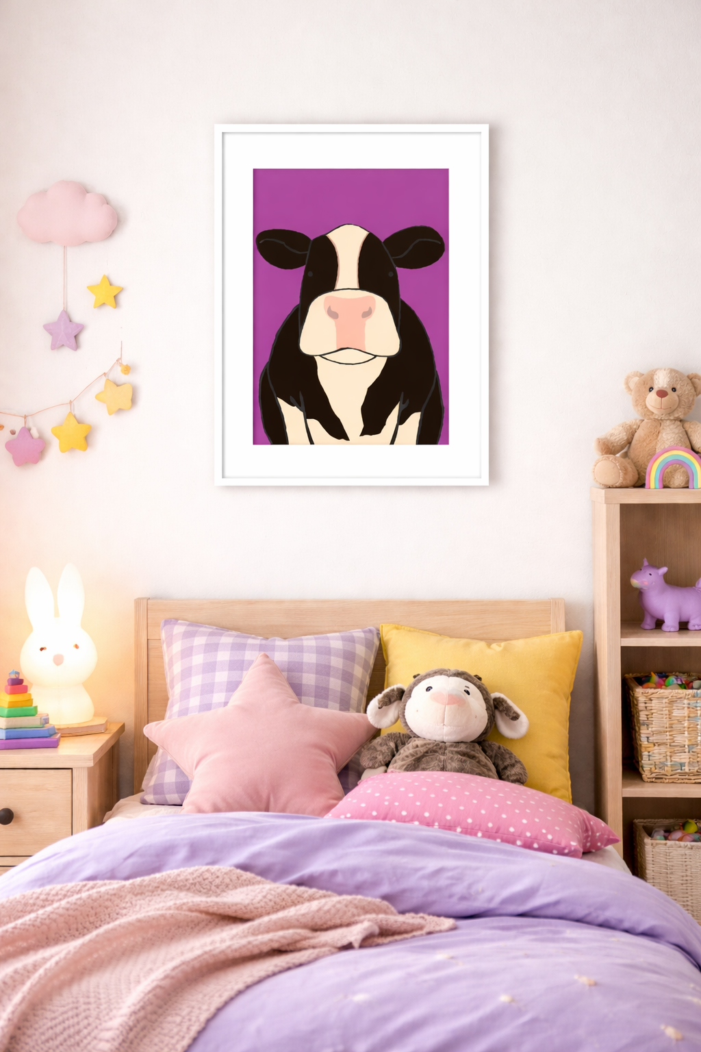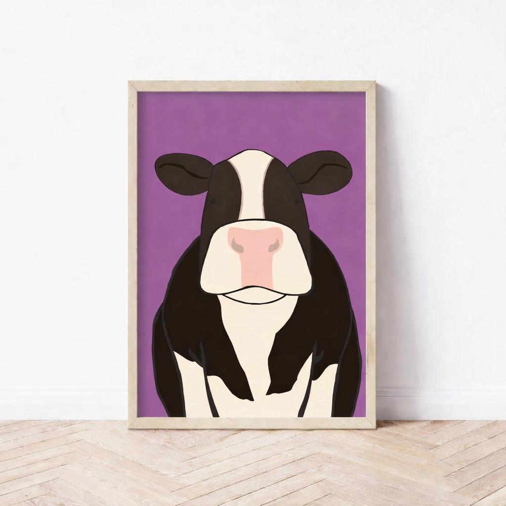 This cow wall art print is perfect for farmhouse kitchens, country homes, nurseries, offices, or modern rustic interiors. Its friendly, minimalist style makes it a wonderful gift for farm animal lovers, cow enthusiasts, rural décor fans, or anyone who appreciates fun animal art.