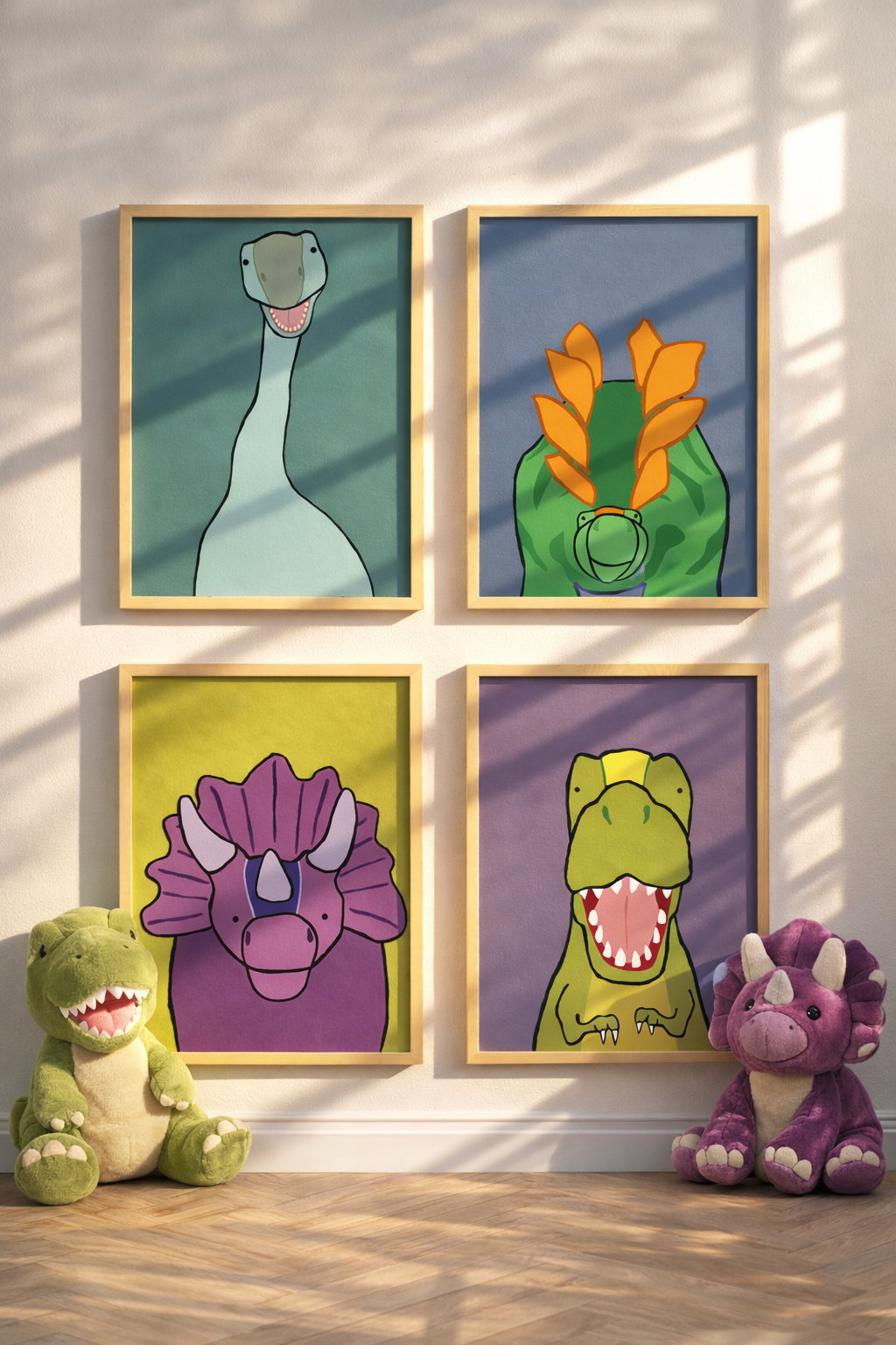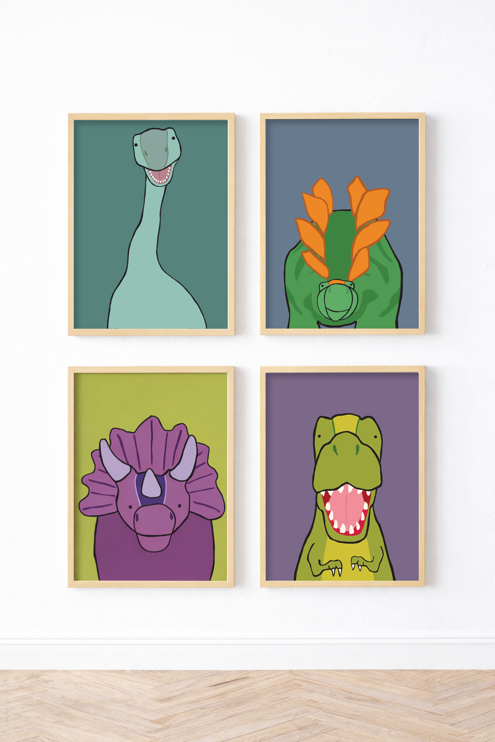 Perfect for kids’ bedrooms, nurseries, playrooms, classrooms, or dinosaur-themed spaces, these prints add personality and imagination to any wall. Each dinosaur portrait is presented on its own colourful background, creating a cohesive gallery set that’s playful, educational, and stylish.