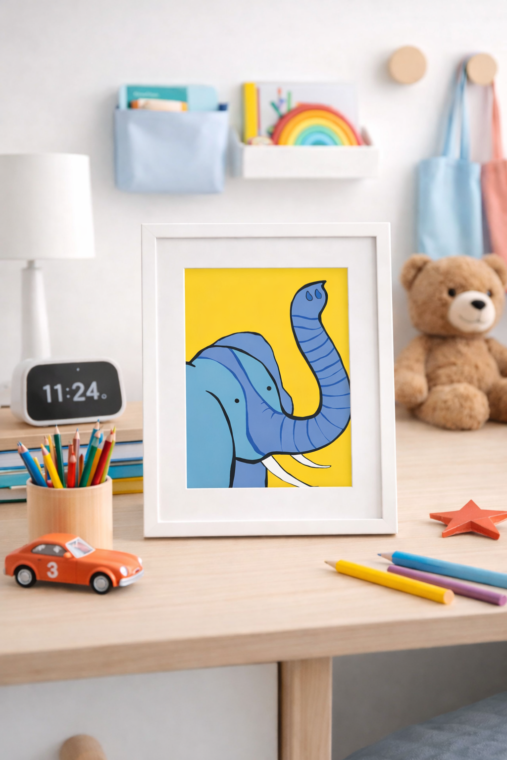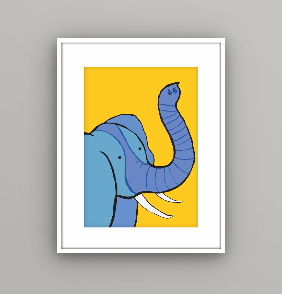 Bring playful charm and modern colour into your space with this elephant art print on premium matte paper. Featuring a bold, hand-illustrated elephant in rich blue tones against a vibrant yellow background, this print adds warmth, personality, and a touch of whimsy to any room.