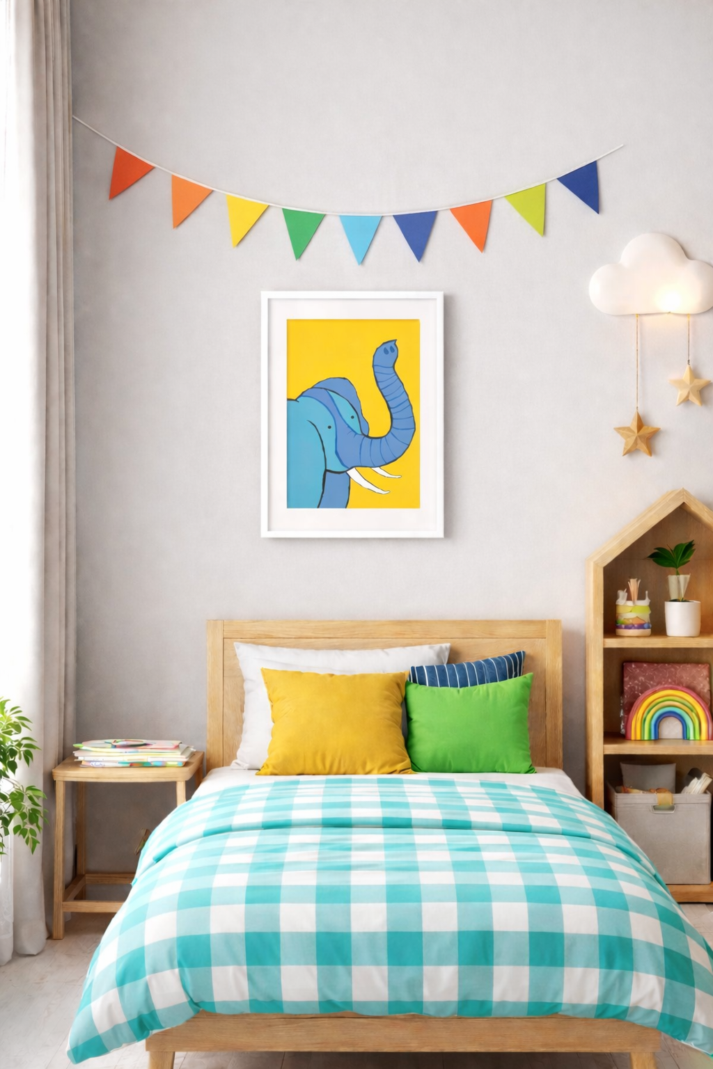 Perfect for nurseries, kids’ rooms, living rooms, offices, or eclectic home décor, this elephant wall art symbolizes strength, wisdom, and good fortune. Its cheerful colour palette and minimalist illustration style work beautifully with modern and contemporary interiors.